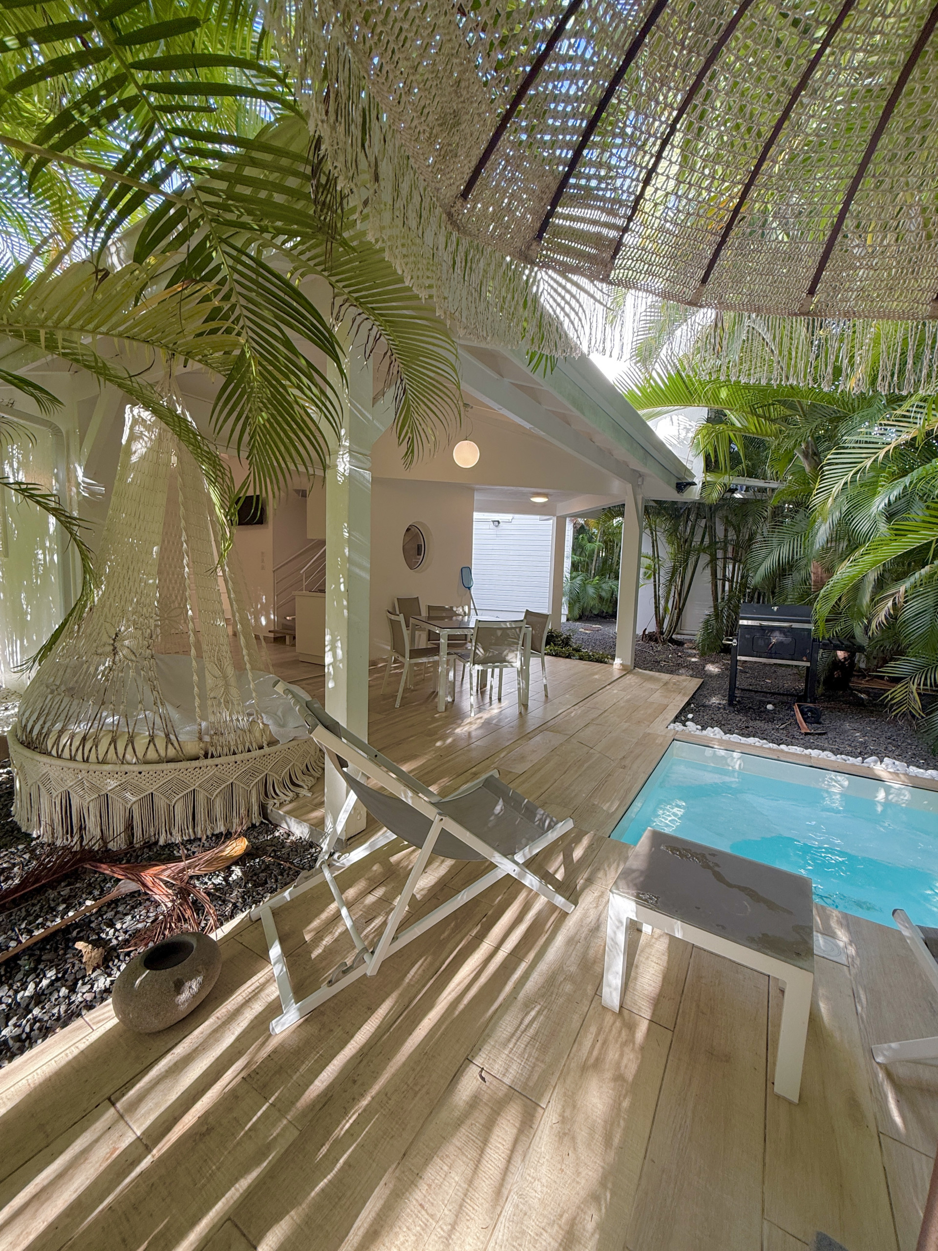 Villa in Le Moule with 1 bedroom(s) and Capacity for 3 people. Accommodation of 50 m². It has garden furniture, washing machine, barbecue, internet access (wifi), hair dryer, air conditioning, private swimming pool, outdoor parking near building, TV.The American kitchen, Electric, is equipped with refrigerator, microwave, oven, dishwasher, crockery/cutlery, utensils/kitchen, coffee maker, toaster and kettle.