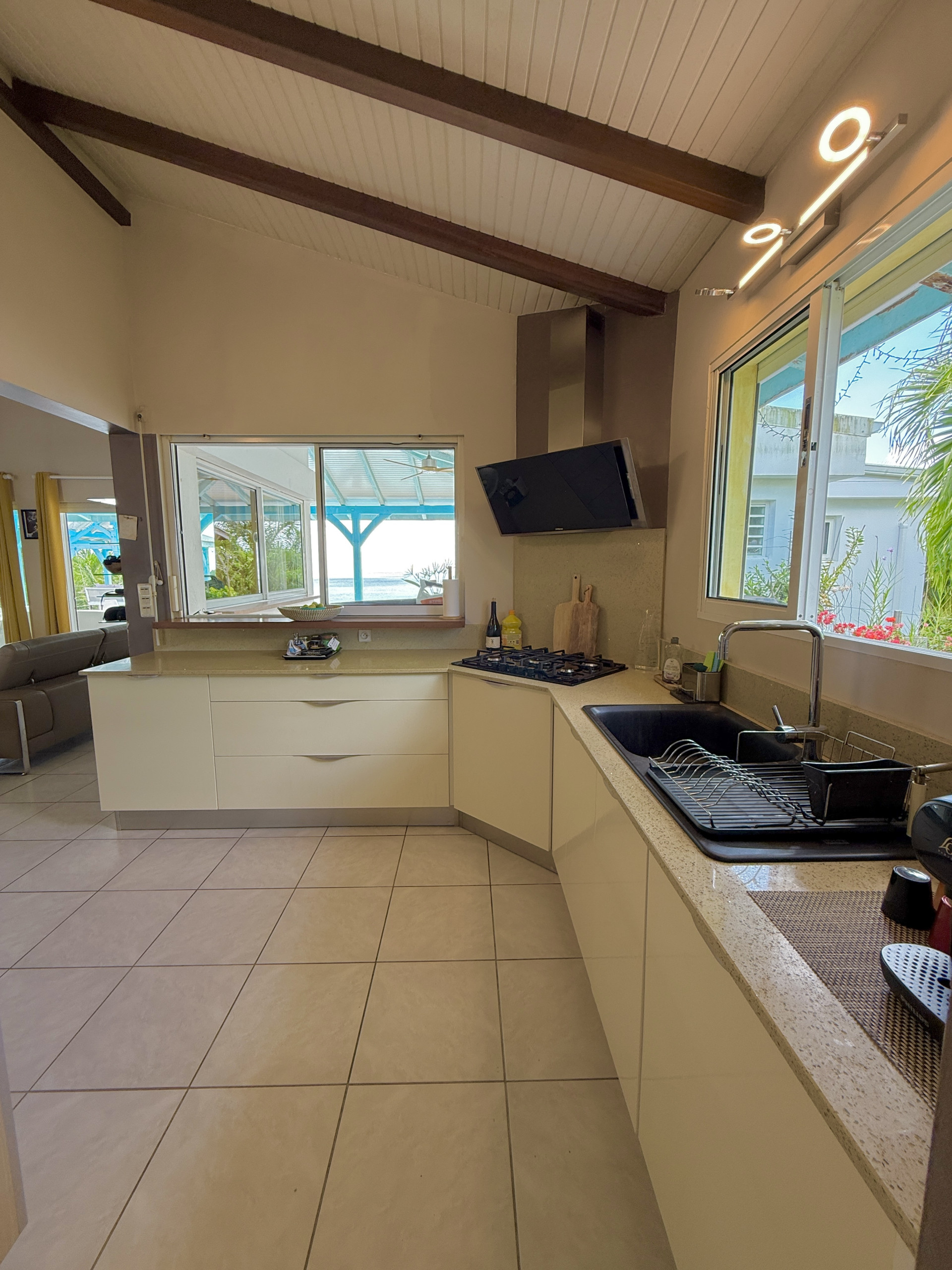 La cuisine américaine, Électrique, est équipée avec réfrigérateur, micro-ondes, four, lave-vaisselle, vaisselle/couverts, ustensiles/cuisine, cafetière, grille pain et bouilloire.